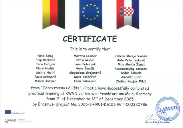 U prepunom amfiteatru škole u četvrtak 19. ožujka 2026. održana je prezentacija projekta Erasmus+ u sklopu kojeg je 17 učenika boravilo 2 tjedna u Njemačkoj u Frankfurtu na Majni kako bi obavili svoju stručnu praksu. Učenici svih 6 smjerova koji su boravili na praksi izradili su zajedničku prezentaciju te pomoću slika i usmeno detaljno opisali svoje iskustvo.